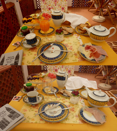 Mas qual o grande segredo deste pequeno-almoço? A singeleza misturada com a fartura. Uma travessa com papaia, melão, pêssego, laranja, figo. O doce… O sumo de laranja. O pão alentejano. Mais! O Pão alentejano torrado e a ainda a deixar escorrer, pecaminosamente, a manteiga. O presunto. A tábua de queijos. Os ovos mexidos. Simples mas reconfortante, como todo o pequeno-almoço deve ser. Para isto, nem o Tarantino tinha a verve necessária.